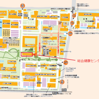 重信分室は、附属病院の西側にある、管理棟1階にあります。管理棟正面入口は2階ですので、階段やエレベーターで下に降りてください。